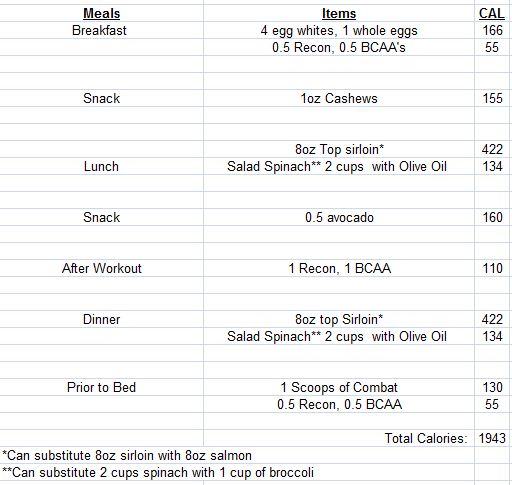 I sent Mike my most up to date meal schedule with calorie counts. He said he’d look it over and probably make some changes to it. I think he’s going to LOWER my calorie intake even more by reducing my 8oz of meat to 6oz but I’m not 100% sure. I’ll just have to sit back and wait for his email. Anyways here’s my daily meal plan I’ve been following since last Monday 12/5.