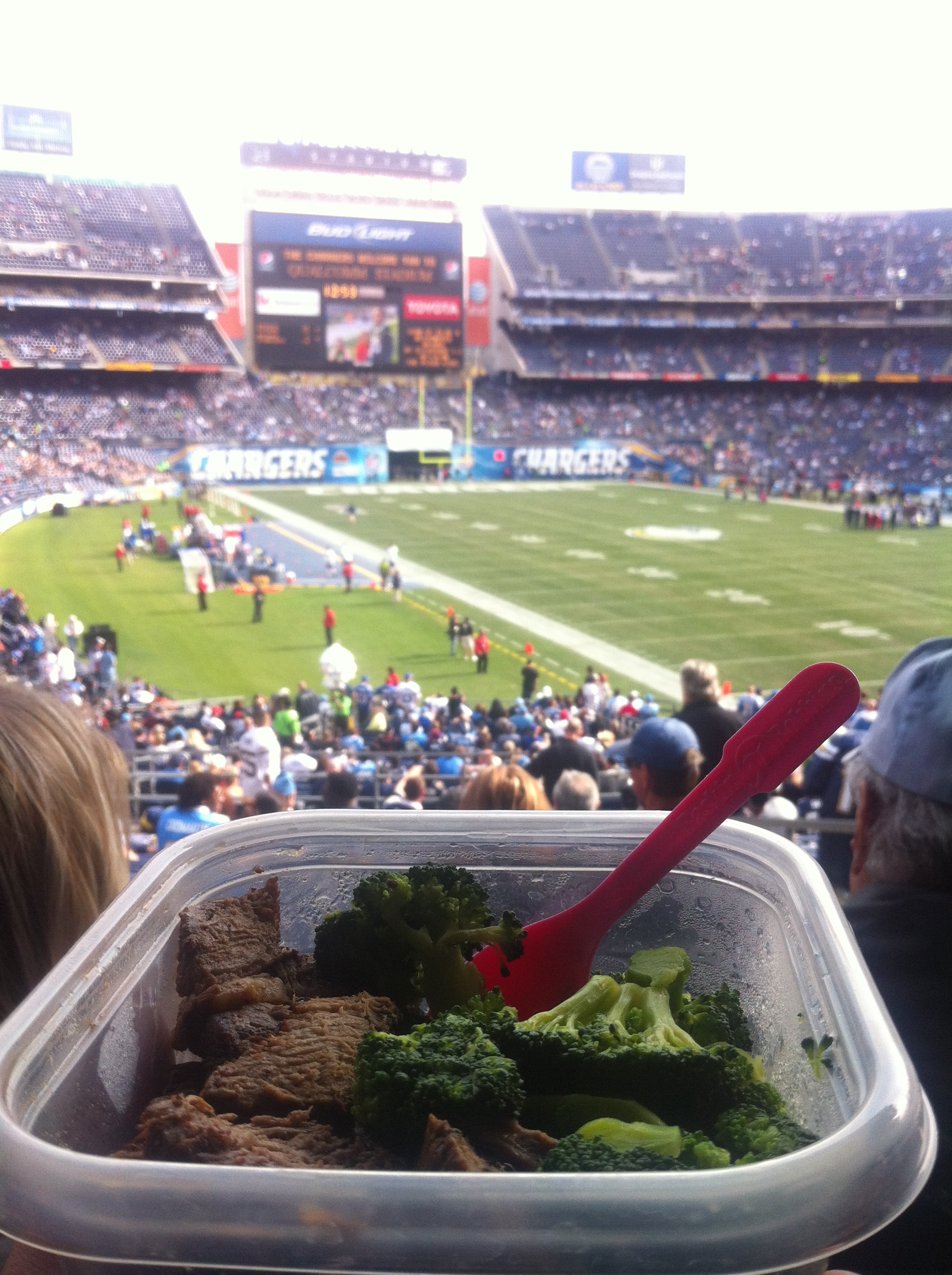 Sunday was Chargers game! Dan and Giselle came by to pick me up. Before they got me they stopped at In N Out. Now everyone knows that I love burritos and eat them 2-3 times a week (and those are mediocre burritos in the Bay). But I honestly love In N Out even MORE! If you’ve ever seen my facebook statuses you know I eat In N Out A LOT. This car ride to Qualcomm was the HARDEST MOMENT ALL WEEK. NO JOKE. The fragrance of double doubles and fries just smashing my face over and over. They ate as quickly as they could to end my torture. They felt so bad but I told them that I don’t want them to at all but yeah it sucked. I was in the backseat seriously sweating and shaking. Made myself eat all of my cashews and chug a bunch of water. I survived my hardest test yet.